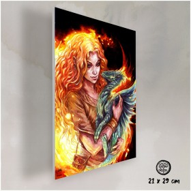 Tableau représentant une jeune fille tenant un dragon dans ses bras, unis dans un arc de feu. Dessin réalisé par mes soins puis imprimé sur un matériau à la fois rigide et souple, léger et imperméable : le Forex©.
